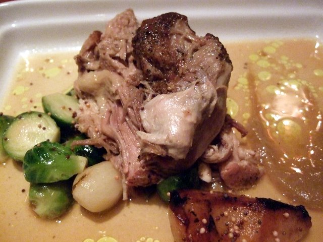 J. ordered the fabulous Braised Shortribs. It was served with some bright and fresh caramelized pear puree, brussel sprouts, and mustard. And the meat was fabulously tender, moist, and juicy. It was like butter! But if it weren’t for the mustard and pear to accompany it, the meat itself would have lacked deep flavor. A surprising disappointment. It was technically perfect, but it lacked a bit of soul.