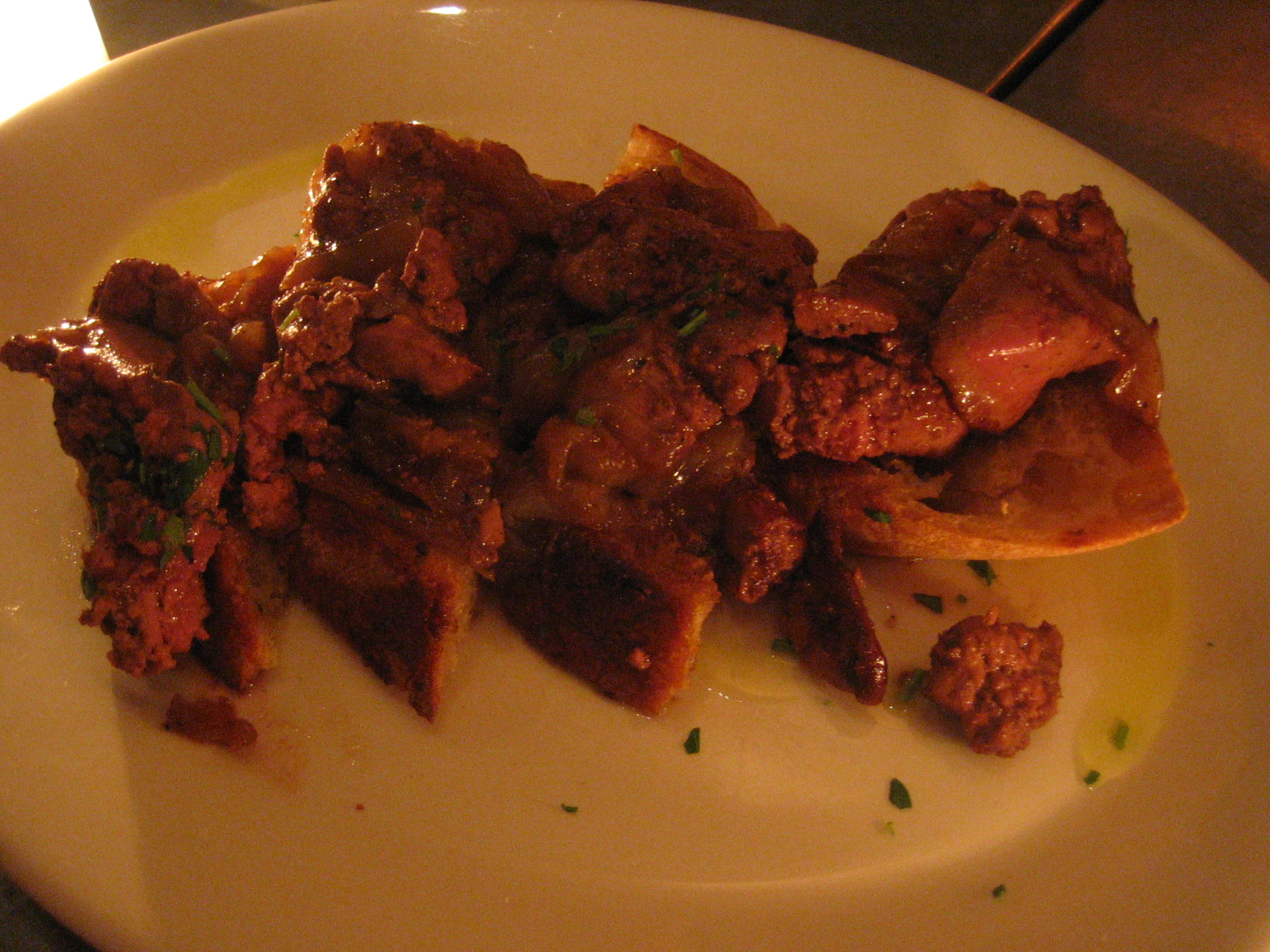 We shared the pork belly with braised lentils and the chicken livers bruschetta to start. I was surprised by both, but in very different ways. The pork belly was seared for a crisp exterior, but it was boring, unimaginative and even slightly dry! Almost impossible for a piece of fatty pork belly. I was disappointed that it wasn’t more inventive. And the lentils were a little too “al dente” for my taste.